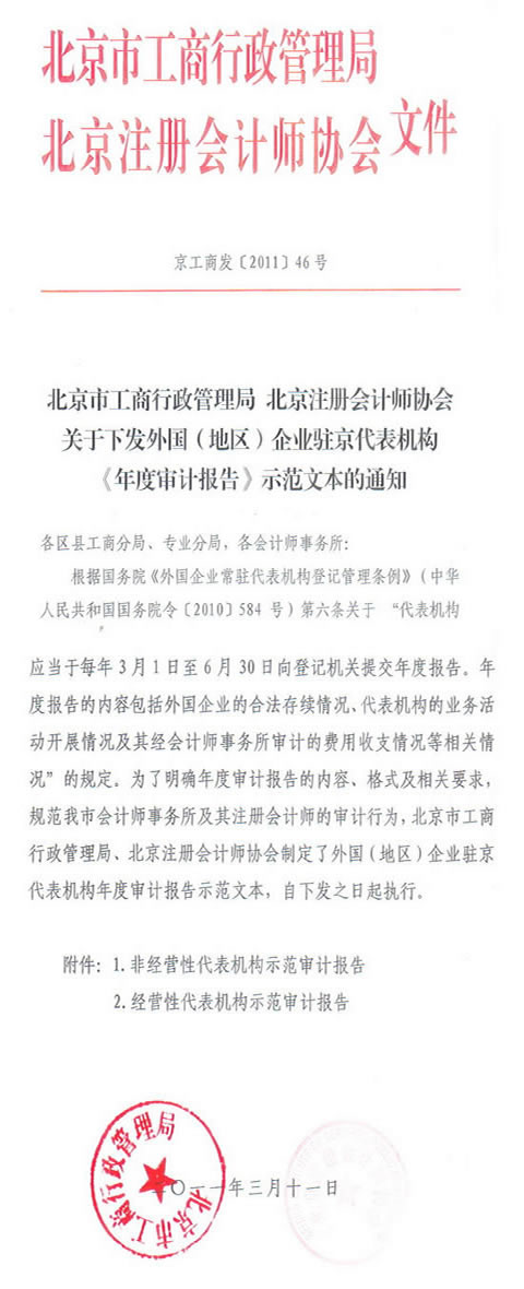 關于下發外國企業駐京代表機構《年度審計報告》示范模板通知
