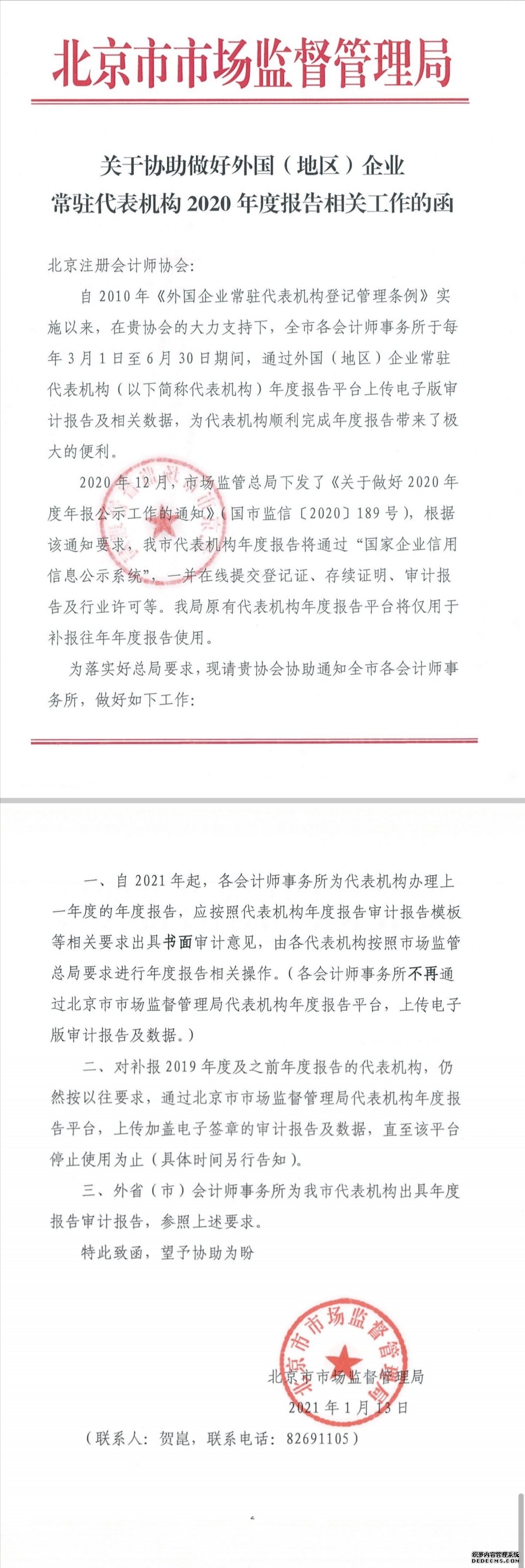 北京市市場監督管理局關于協助做好代表機構2020年度報告相關工作的函